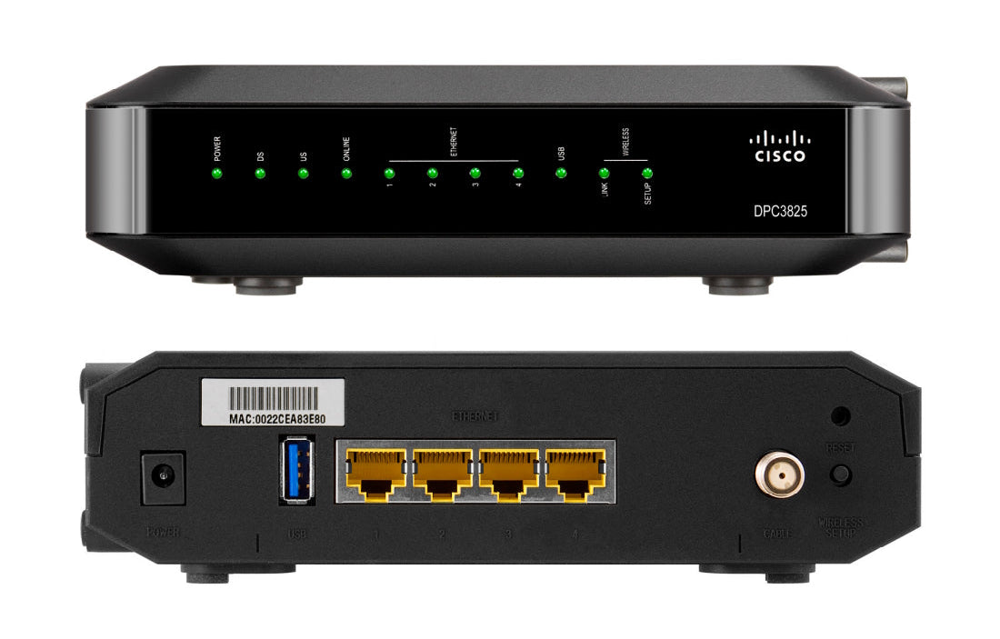 The Cisco Model DPC3825 8x4 DOCSIS 3.0 Wireless Residential Gateway (DPC3825) is a high-performance home gateway that combines a cable modem, router and wireless access point in a single device providing a cost-effective voice and networking solution for both the home and small office. The DPC3825 provides a faster connection to the Internet by incorporating eight bonded downstream channels along with four bonded upstream channels. These bonded channels can deliver downstream data rates in excess of 340 Mbps and upstream data rates in excess of 120 Mbps. That’s up to eight times faster downloads than conventional single-channel DOCSIS® 2.0 cable modems.