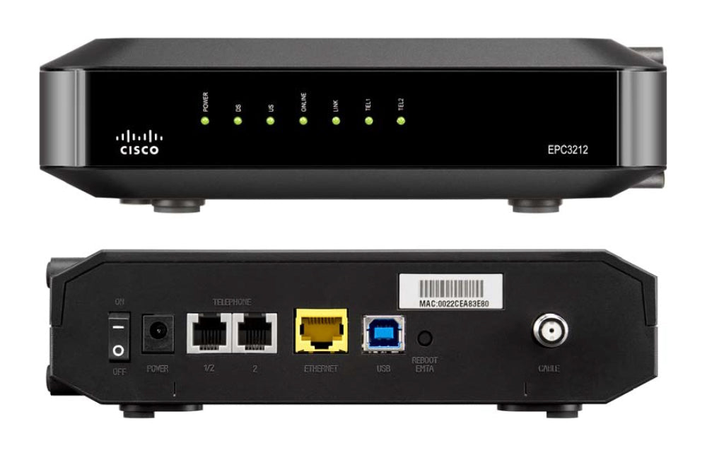 The Cisco Model EPC3212 EuroDOCSIS 3.0 8x4 Cable Modem with Embedded Digital Voice Adapter (EPC3212) is a high-speed cable modem with an embedded digital voice adapter. The EPC3212 provides a faster connection to the Internet by incorporating eight bonded downstream channels along with four bonded upstream channels. These bonded channels deliver downstream data rates in excess of 440 Mbps. That’s up to eight times faster than conventional single-channel EuroDOCSIS™ 2.0 cable modems.1