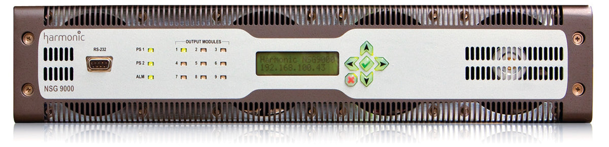 The NSG™ 9000-40G is the latest generation of the Harmonic ultra-dense universal edgeQAM system, capable of reaching up to 648 QAM RF outputs per unit. The device is designed as a highly integrated digital video gateway which multiplexes on-demand content streamed over an IP network. The NSG 9000-40G was engineered for scalability, and is capable of growing in QAM density from 8 to 648 QAMs per unit. In addition to providing unparalleled output density, the NSG 9000-40G is designed to support a variety of applications, including video on demand (VOD), switched digital video (SDV), broadcast, modular cable modem termination systems (M-CMTS) and Direct to Edge (D2E) for cable IPTV.